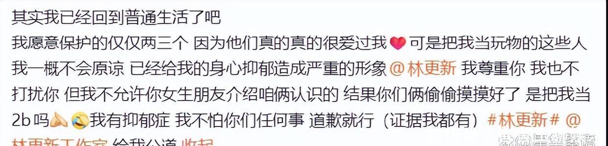 事件始于1月3日凌晨,司晓迪在社交媒体上连续发文,不仅点名十余位男星,还晒出各种“证据”。她指控林更新将她当作“玩物”,并导致她抑郁症加重。